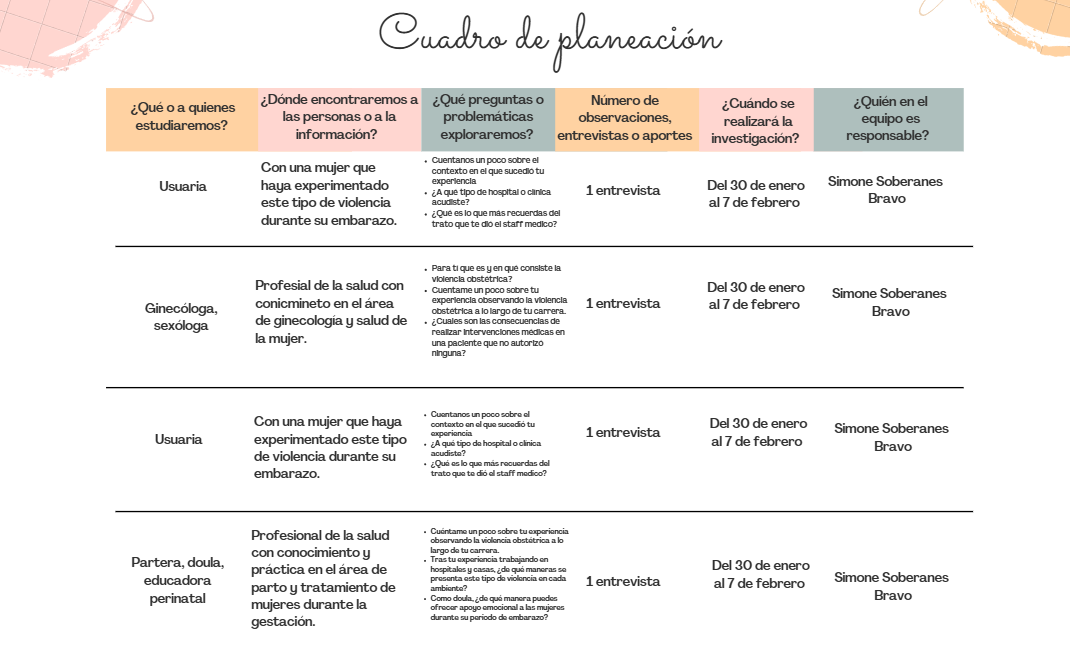 Planeación: Mi objetivo con la investigación secundaria es poder obtener de diferentes fuentes información que me permita entender qué es la violencia obstétrica, cuál es la forma en la que se da y cuáles son las consecuencias externas e internas que una mujer sufre al experimentarla, de igual manera busco entender cuál es su impacto en la sociedad...