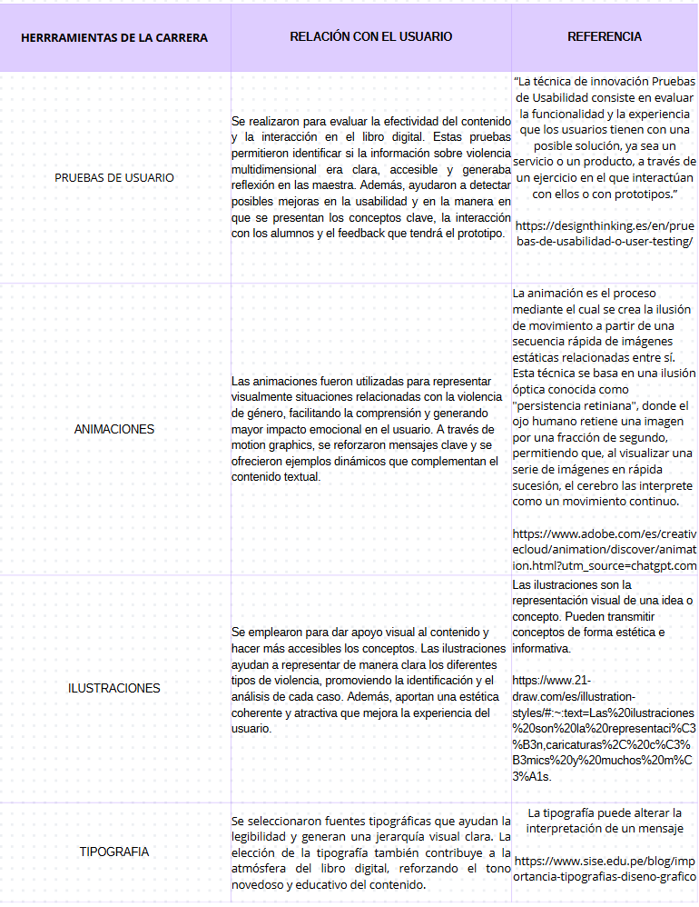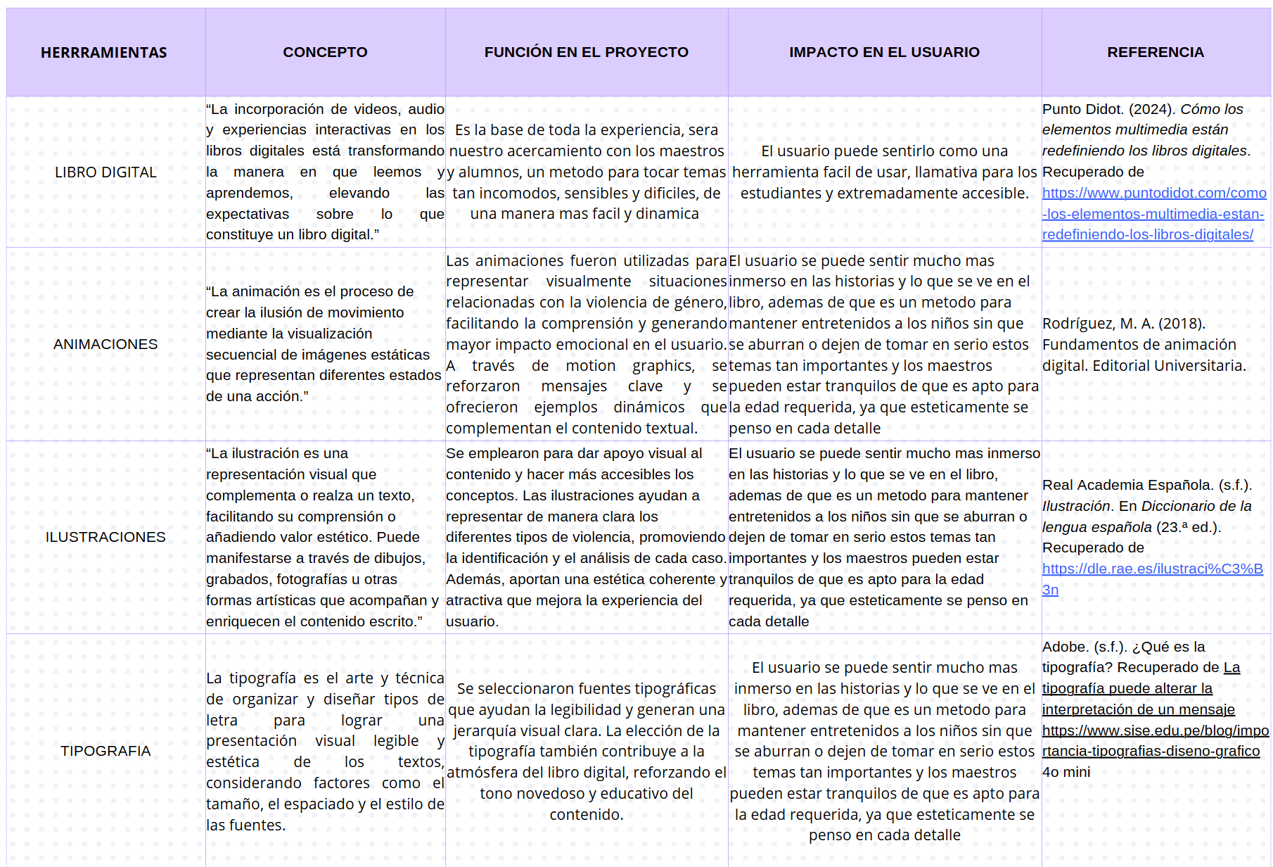 Si bien nuestro prototipo no depende únicamente de estas herramientas, estas juegan un papel clave en la construcción de una experiencia coherente, dinámica y efectiva para la enseñanza de la violencia multidimensional con perspectiva de género. Su selección responde a la necesidad de mantener una interacción constante y una ambientación adecuada que favorezca el aprendizaje. Además, otras herramientas que complementan este proceso se detallan en el apartado de usuario.