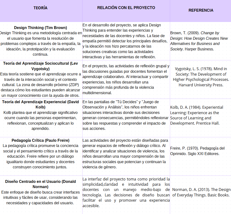 La teoría nos permitió profundizar en los elementos esenciales para el desarrollo de la propuesta. Más allá de las dificultades que enfrentan las maestras al abordar la violencia multidimensional en perspectiva de género, fue clave analizar investigaciones y enfoques que aportaran estrategias efectivas para mejorar la enseñanza y superar estos retos. Se buscó, sobre todo, integrar técnicas que fomenten el diálogo en el aula, impulsen el pensamiento crítico a través de experiencias, contribuyan a generar dinámicas más participativas y colaborativas entre el alumnado.